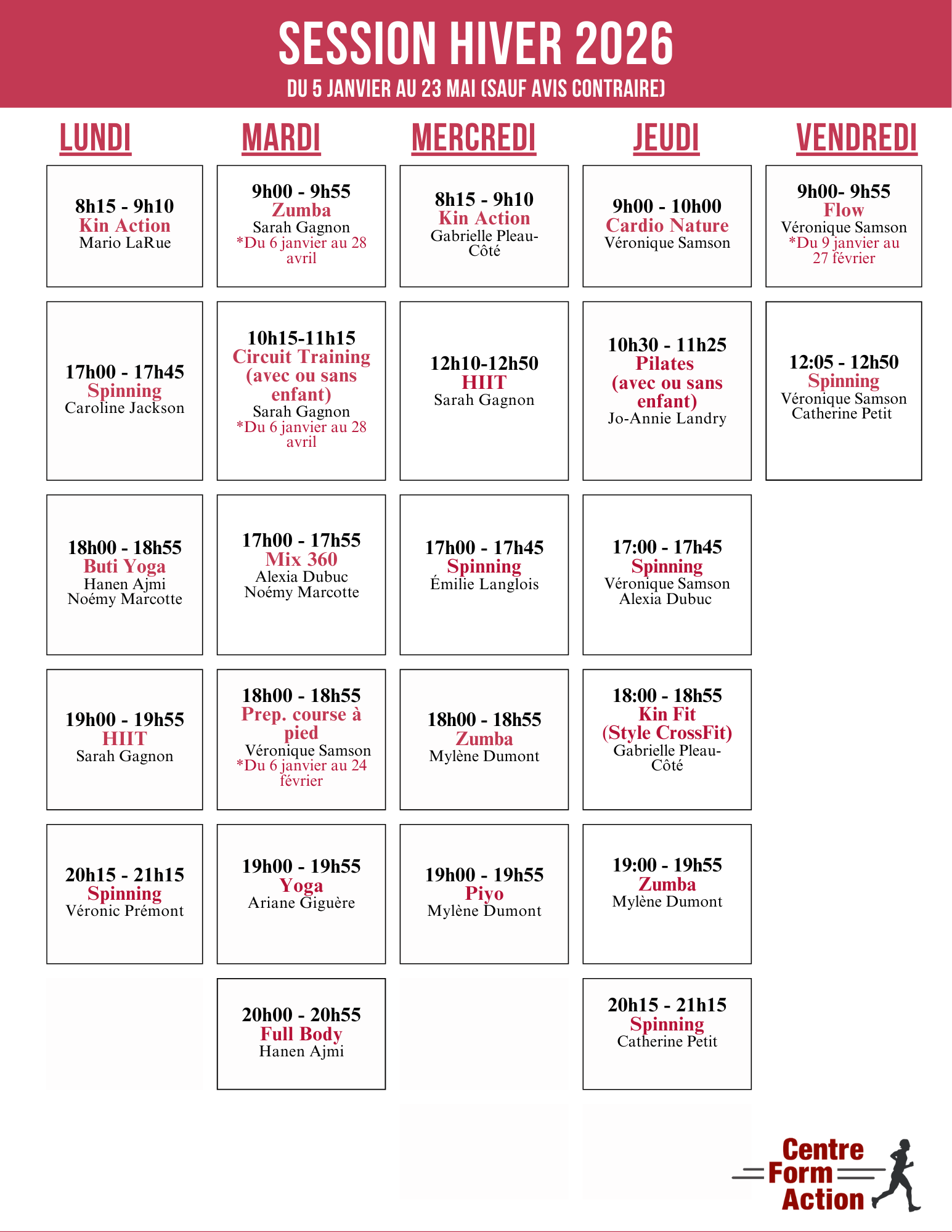 En plus des kinésiologues disponibles en permanence pour superviser les entraînements et répondre aux besoins des membres, des professeurs chevronnés offrent des cours de groupe diversifiés.